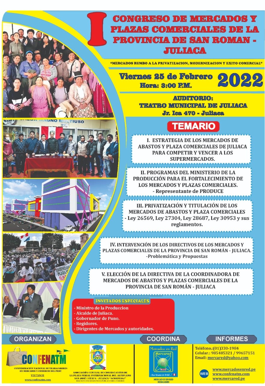 ESTE 25 DE FEBRERO 2022, SE REALIZARÁ EL "I CONGRESO DE MERCADOS Y PLAZAS COMERCIALES DE LA PROVINCIA DE SAN ROMAN - JULIACA", evento que es organizado por la Confederación de mercados y comercio del Perú "CONFENATM" y "MERCARED" que preside a nivel Nacional el Dr. CARLOS AGUILAR CONTRERAS. En la organización están participando la Plaza Comercial Internacional San José, con su presidente JOEL BERRIO ALVARO, el Vice-presidente ALEJANDRO PARICAHUA, el secretario ERNESTO FLORES y los mienbros de la directiva Central, así mismo dirigentes a nivel Provincial, así como el coordinador región Sur de CONFENATM Efraín Puma Mamani.